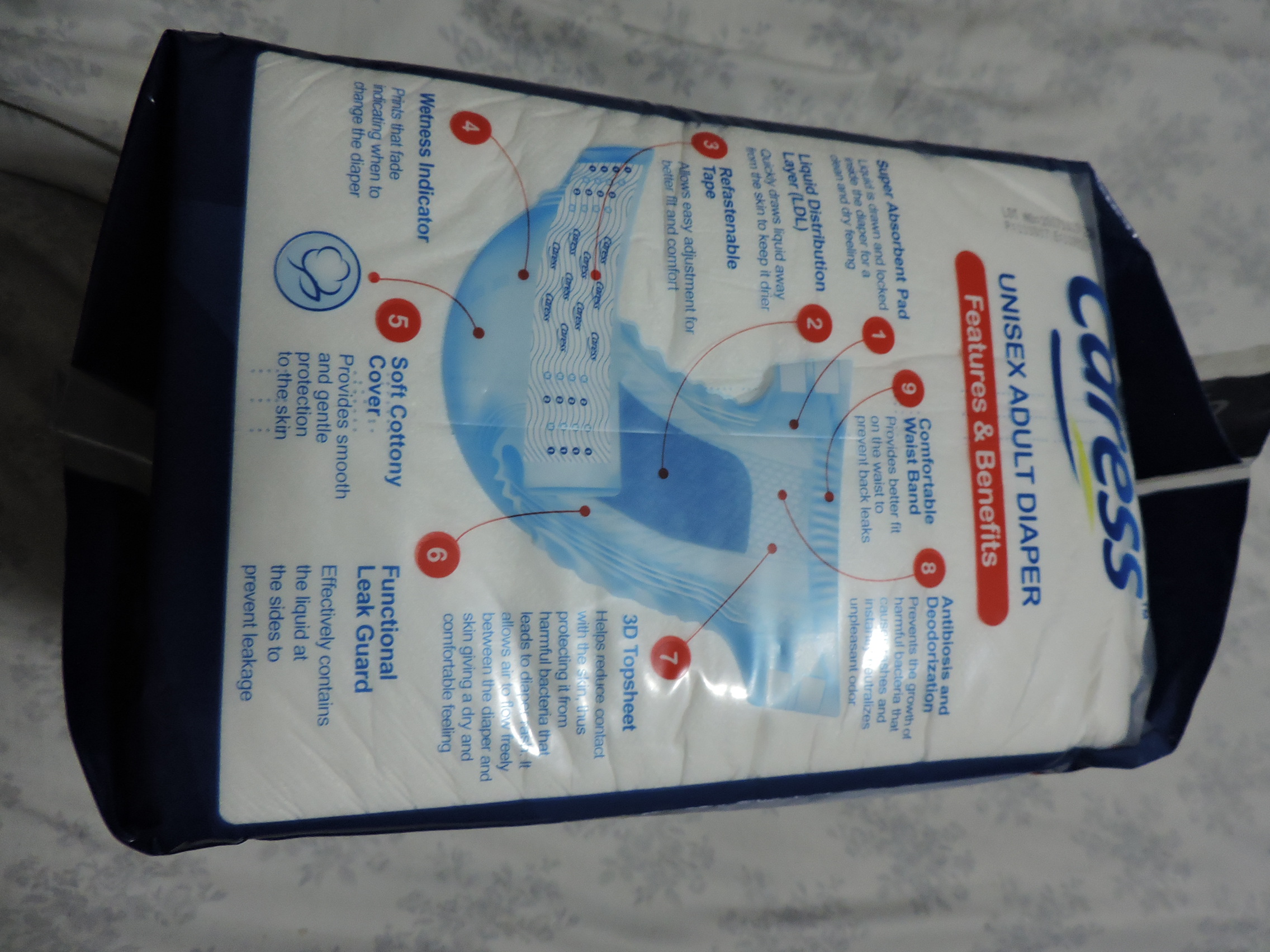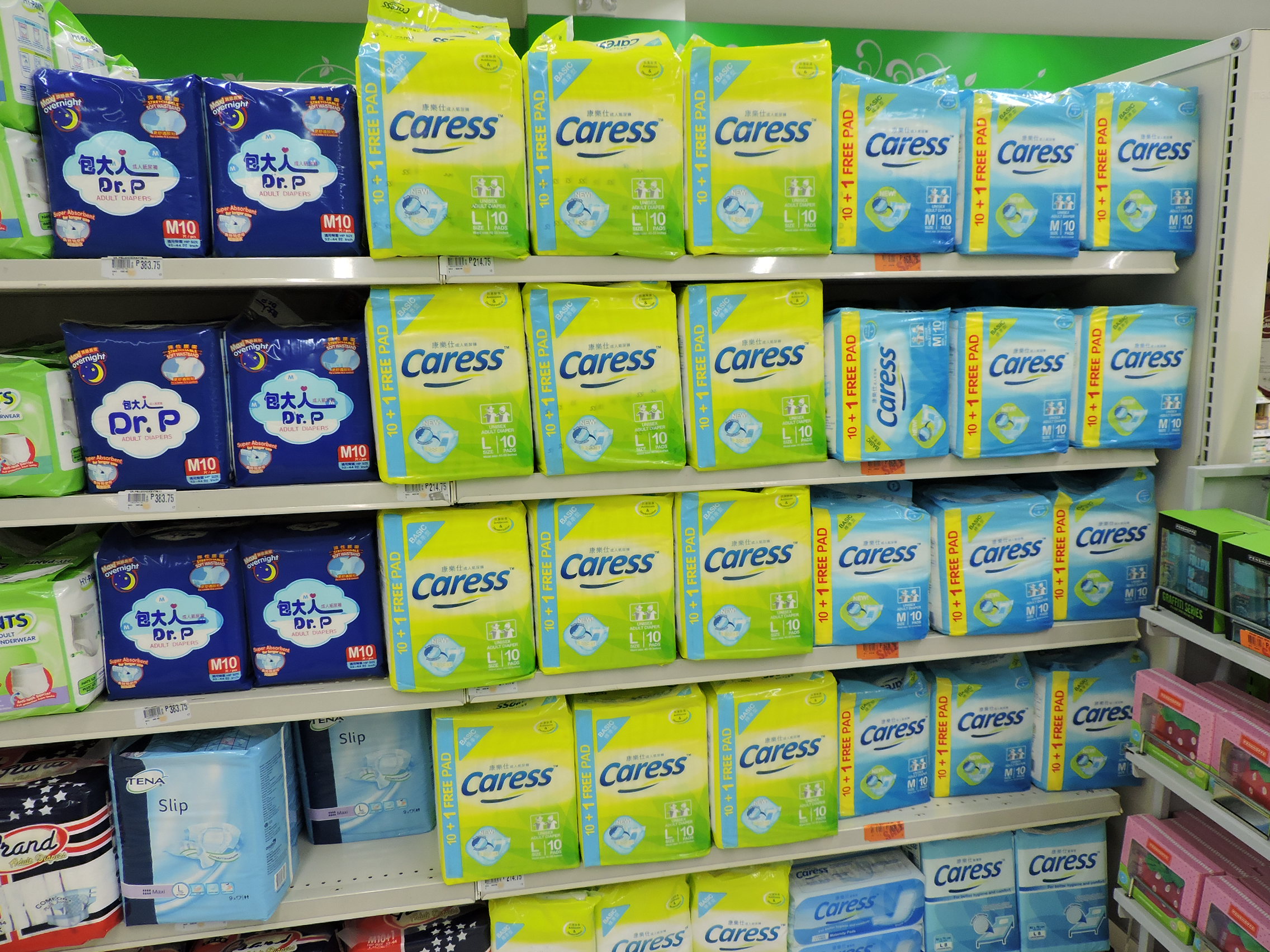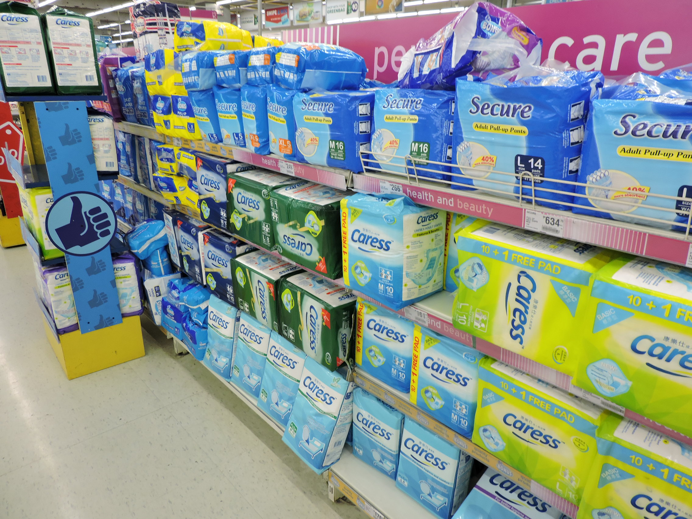 My wife and I just returned from a month in the Philippines visiting our daughter and family in Manila. Almost all the newer grocery stores in the Philippines carry some diapers for adults. Some of the stores are Robinson's Supermarket and SM Hypermart. Many of the stores have some high quality super absorbent diapers, much better than what we can buy in any retail store here in the US. Two photos show the diapers available in two stores. The Caress brand is very good quality. They make a "daytime" and an "Overnight" version. The overnight is very good and almost as absorbent as the Seni Super. It is a cloth backed diaper with elastic waist band and leak guards. It has a plastic landing zone for the tapes that can be refastened several times.