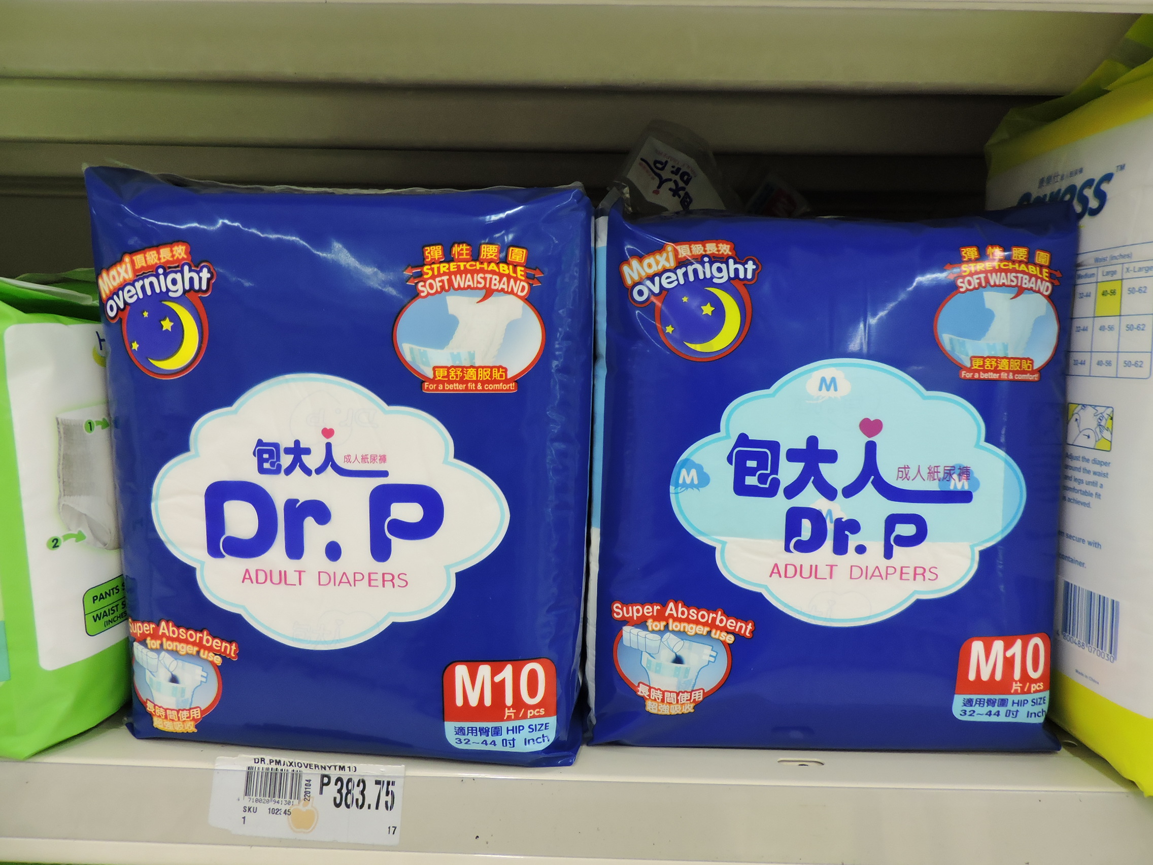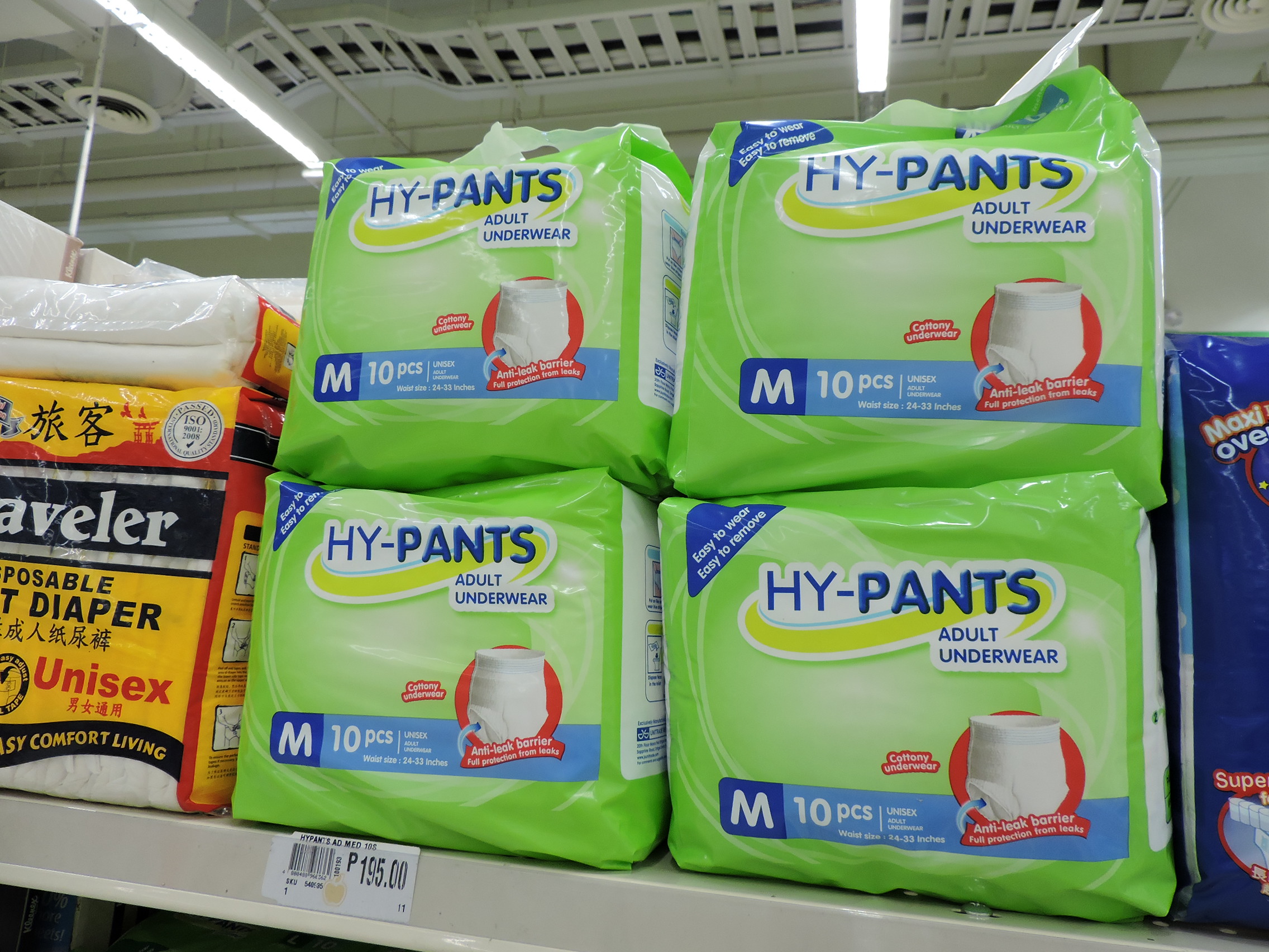 I was also very glad to find the Tena Maxi Slip, also in a grocery store. The one that my wife and I got a real laugh from is the Dr. P. It is a plastic backed diaper with leak guards and elastic. It has pretty good absorbancy. A bit hot with the plastic in the 88 to 90 degree heat with no air conditioning! The Hy Pants are a pull-up, just not very absorbent, but very soft.