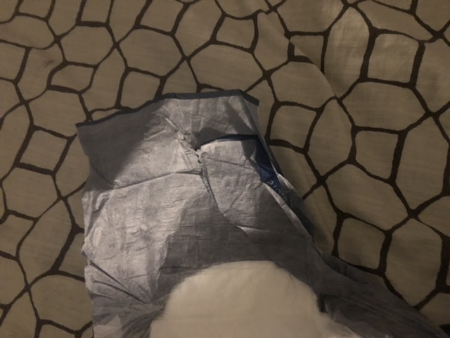 Except with that good fit came a terrible side effect. The way I tape my diapers is to tape the top tabs first tightly around my waist and then I pull up the diaper from the back so that there is a good seal around the legs before taping the bottom tabs. This creates a pocket and channel in the front of the diaper and leads to less leaks for me. The problem I had is that I was getting strangulation marks on my groin in the front of my thighs because the extra fabric cuts into the skin.