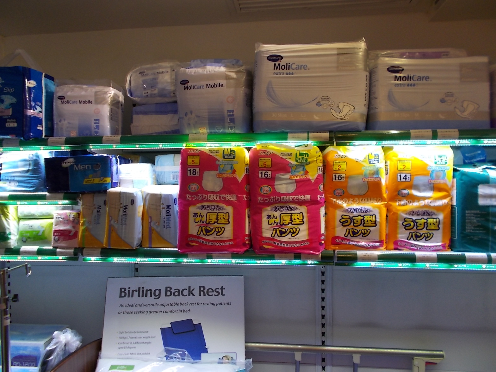 Tewi has provided photos of “Hong Kong Medical Supplies” and notes that he actually buys diapers at this store. You will see that the store carries Molicare and Tena, in addition to local brands.